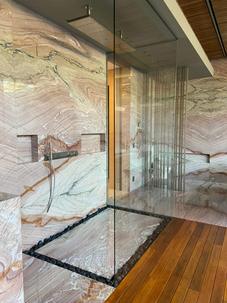 O quartzito Negroni, com seu fundo branco e veios marcantes em tons de marsala, é um verdadeiro destaque em projetos arquitetônicos. A cor marsala, reconhecida por sua profundidade e calor, é amplamente utilizada na arquitetura para criar espaços acolhedores e sofisticados. Ela combina perfeitamente com materiais naturais e texturas variadas, promovendo um contraste equilibrado e refinado.